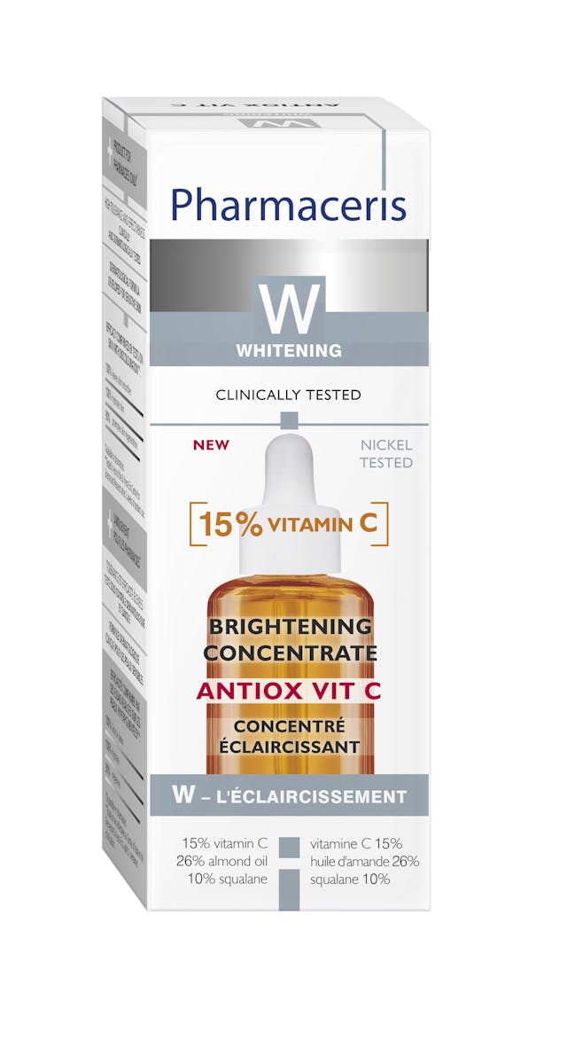 The Antiox Vitamin C Brightening Concentrate with 15% Vitamin C by Pharmaceris is a potent serum designed to address skin discolorations, brown spots, and uneven skin tone.